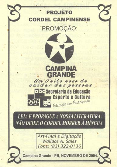 Projeto Cordel Campinense. Inclui nota sobre a história do cordel.