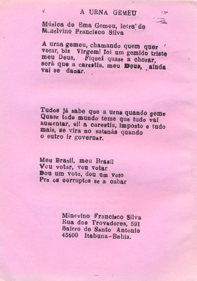 Na contracapa, poesia do autor: A urna gemeu, adaptação da música a Ema gemeu. |