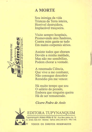 Na contracapa poesia "A morte", por Cícero Pedro de Assis. |