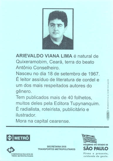 A coleção apresenta a publicação dos 20 folhetos classificados no 1º Concurso Paulista de Literatura de Cordel, promovido pela CPTM e Metrô de São Paulo, empresas vinculadas à Secretaria de Estado dos Transportes Metropolitanos. Os trabalhos foram julgados por uma comissão formada por Valdeck de Garanhuns, Téo Azevedo, Klévisson Viana, Cláudio Sá, Marcelo Cunha e presidida por Sebastião Marinho, da União dos Cantadores Repentistas e Apologistas do Nordeste - UCRAN. Os três primeiros lugares foram conquistados por Rouxinol do Rinaré, Zé Maria de Fortaleza e Andorinha respectivamente. Inclui breve biografia do autor. Título variante: O trem metropolitano na palma da sua mão. |